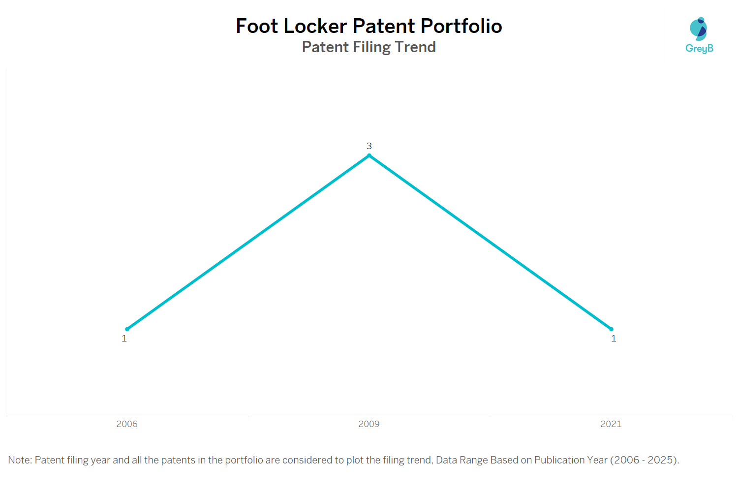 Foot Locker (Excluding its subsidiaries) has filed 4 patent applications at USPTO so far (Excluding Design and PCT applications). Out of these 3 have been granted leading to a grant rate of 75.0%.