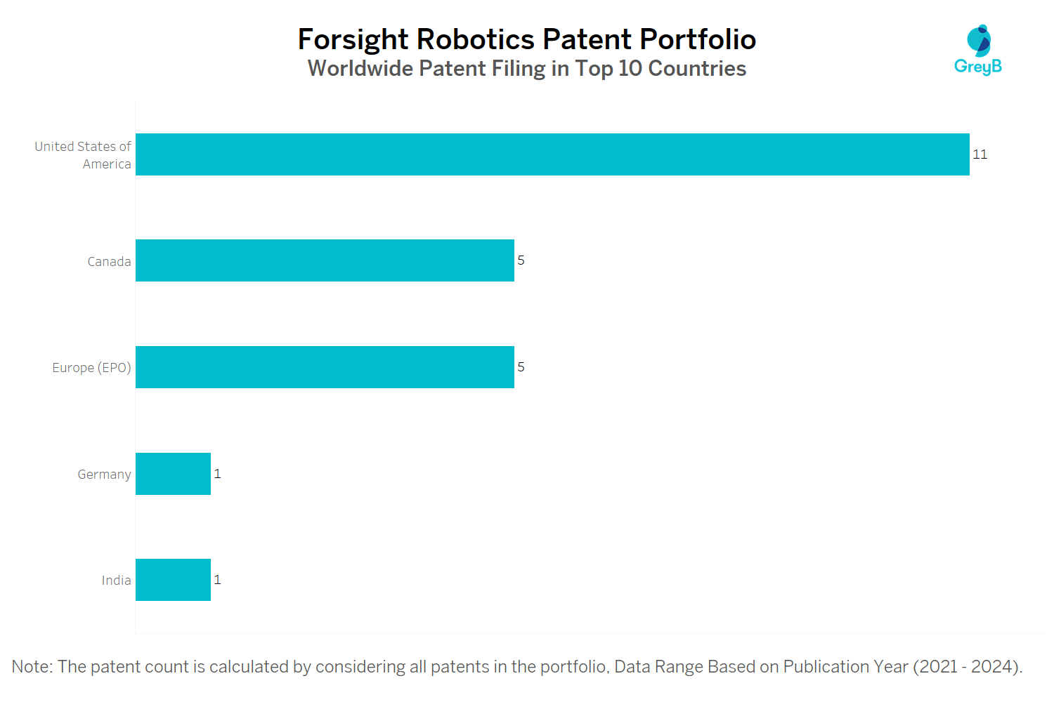 Forsight Robotics has a total of 35 patents globally, out of which 2 have been granted. Of these 35 patents, more than 77% patents are active. United States of America is where Forsight Robotics has filed the maximum number of patents, followed by Europe (EPO) and Canada. Parallelly, United States of America seems to be the main focused R&D centre and also Israel is the origin country of Forsight Robotics.
