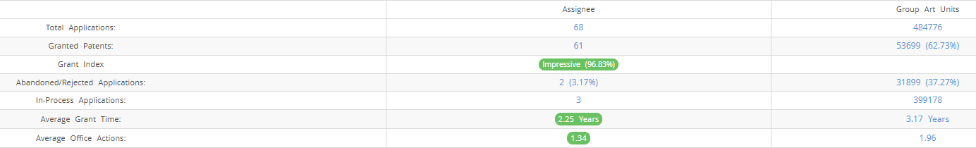 Gemini IP LLC (Excluding its subsidiaries) has filed 68 patent applications at USPTO so far (Excluding Design and PCT applications). Out of these 61 have been granted leading to a grant rate of 96.83%.