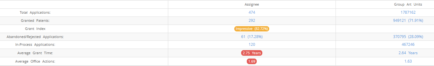 Hollister Inc (Excluding its subsidiaries) has filed 474 patent applications at USPTO so far (Excluding Design and PCT applications). Out of these 292 have been granted leading to a grant rate of 82.72%.