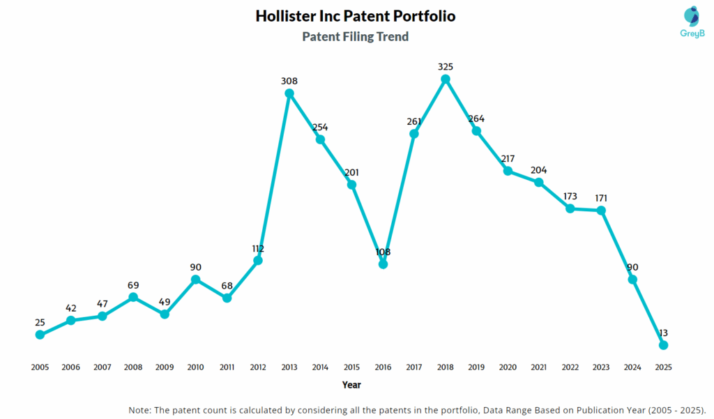 | Year of Patents Filing or Grant | Hollister Inc Applications Filed | Hollister Inc Patents Granted |