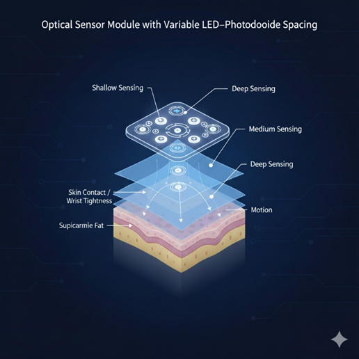 Several Huawei-related patents describe optical sensor modules with non-uniform LED–photodiode spacing. Instead of relying on a single fixed optical path, these designs enable different sensing depths and signal behaviors under varying conditions.