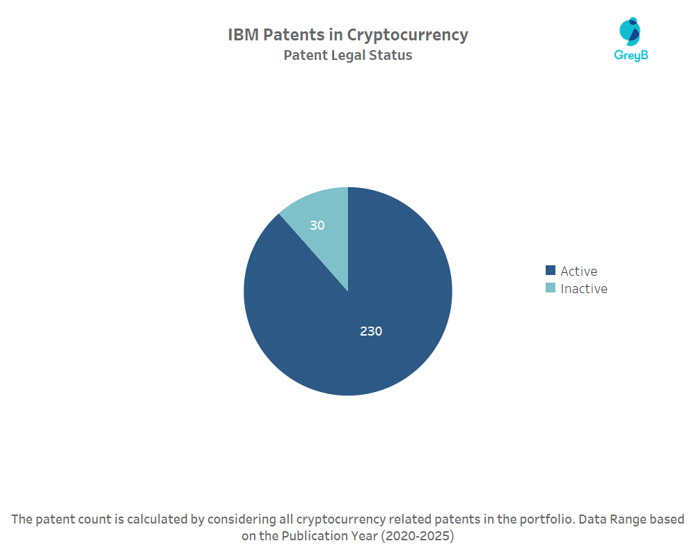 IBM has a total of 260 patents globally in Cryptocurrency. These patents belong to 185 unique patent families. Out of 260 patents, 230 patents are active.
