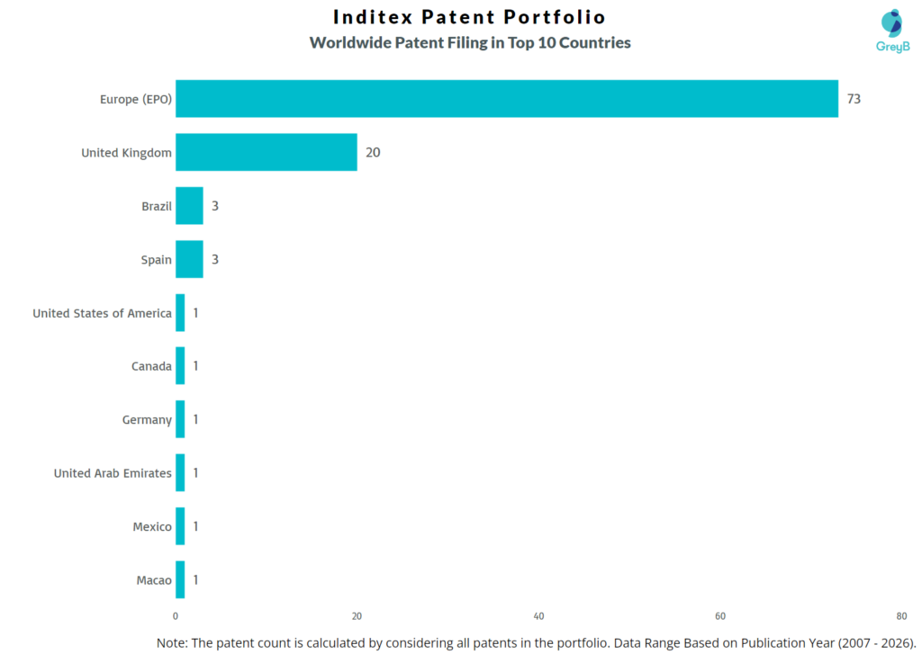 Inditex has a total of 120 patents globally, out of which 118 have been granted. Of these 120 patents, more than 77% patents are active. Europe (EPO) is where Inditex has filed the maximum number of patents, followed by United Kingdom and Brazil. Parallelly, Europe (EPO) seems to be the main focused R&D center and Spain is the origin country of Inditex.