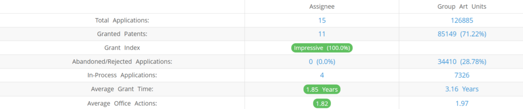 Infinite Athlete (Excluding its subsidiaries) has filed 15 patent applications at USPTO so far (Excluding Design and PCT applications). Out of these 11 have been granted leading to a grant rate of 100.0%.
