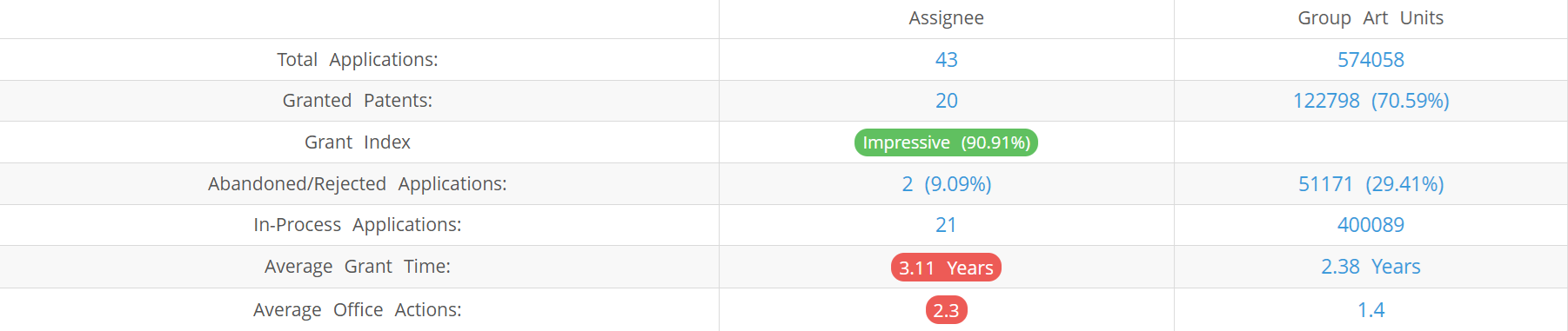 Inflazome (Excluding its subsidiaries) has filed 43 patent applications at USPTO so far (Excluding Design and PCT applications). Out of these 20 have been granted leading to a grant rate of 90.91%.