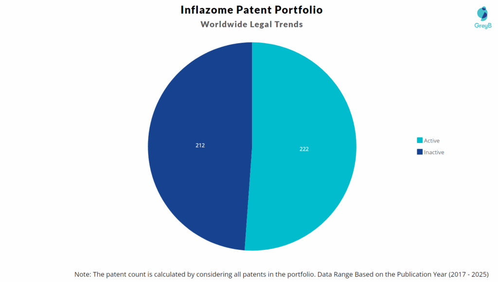 Inflazome has a total of 434 patents globally. These patents belong to 35 unique patent families. Out of 434 patents, 222 patents are active.