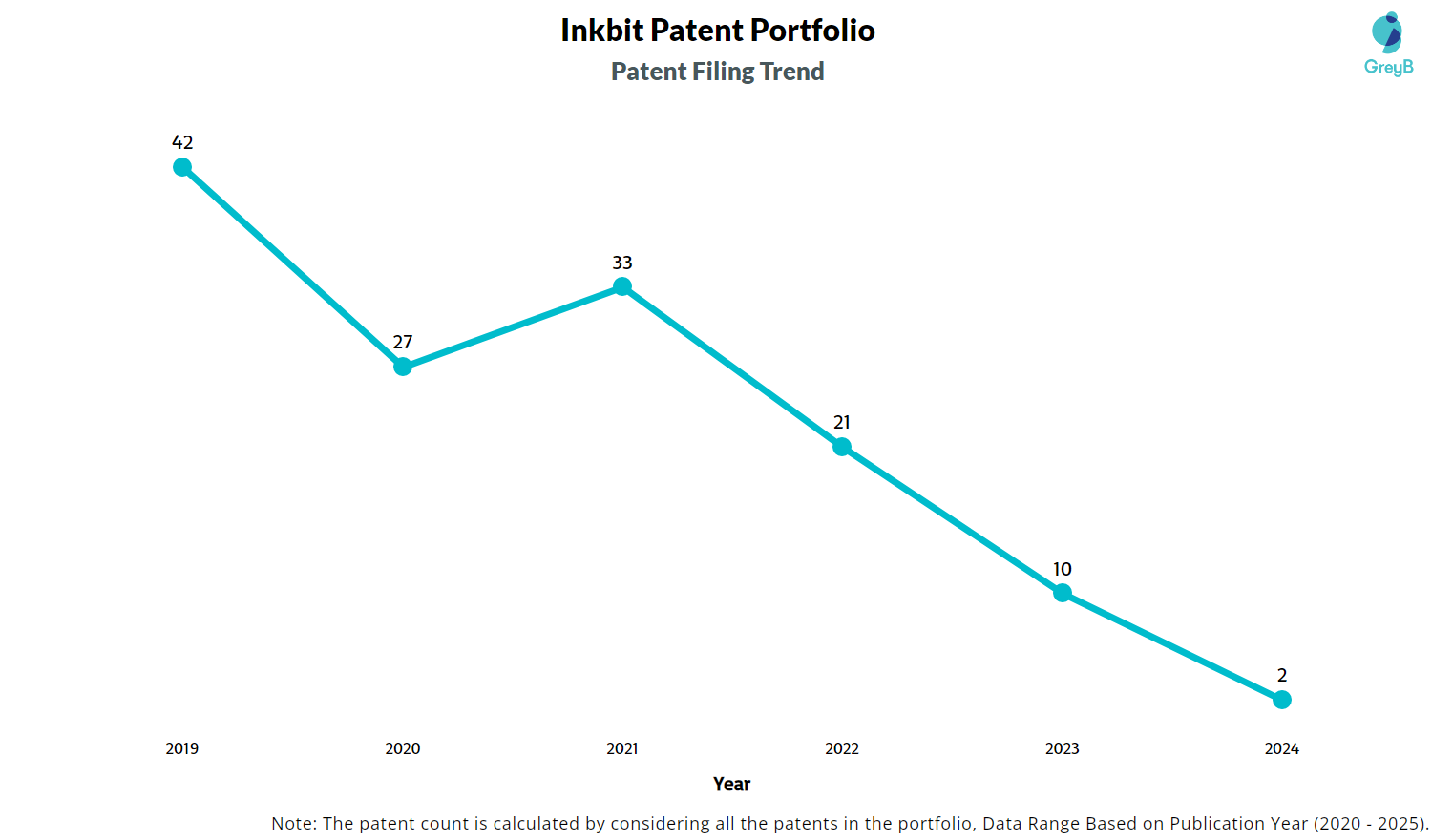 Inkbit (Excluding its subsidiaries) has filed 42 patent applications at USPTO so far (Excluding Design and PCT applications). Out of these 28 have been granted leading to a grant rate of 87.5%.