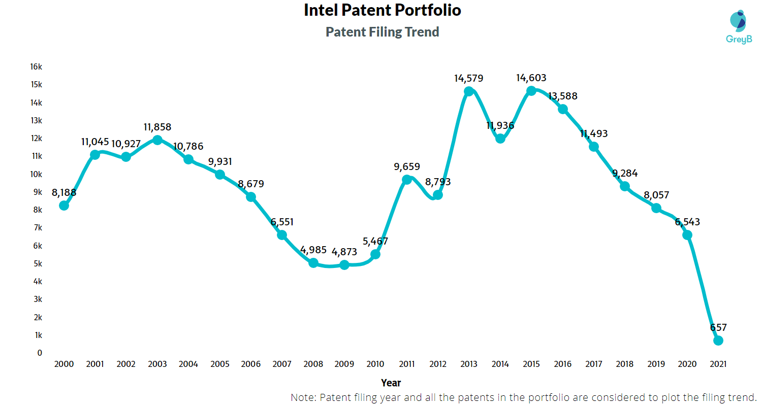 | Year of Patents Filing or Grant | Intel Patents Applications Filed | Intel Patents Granted |