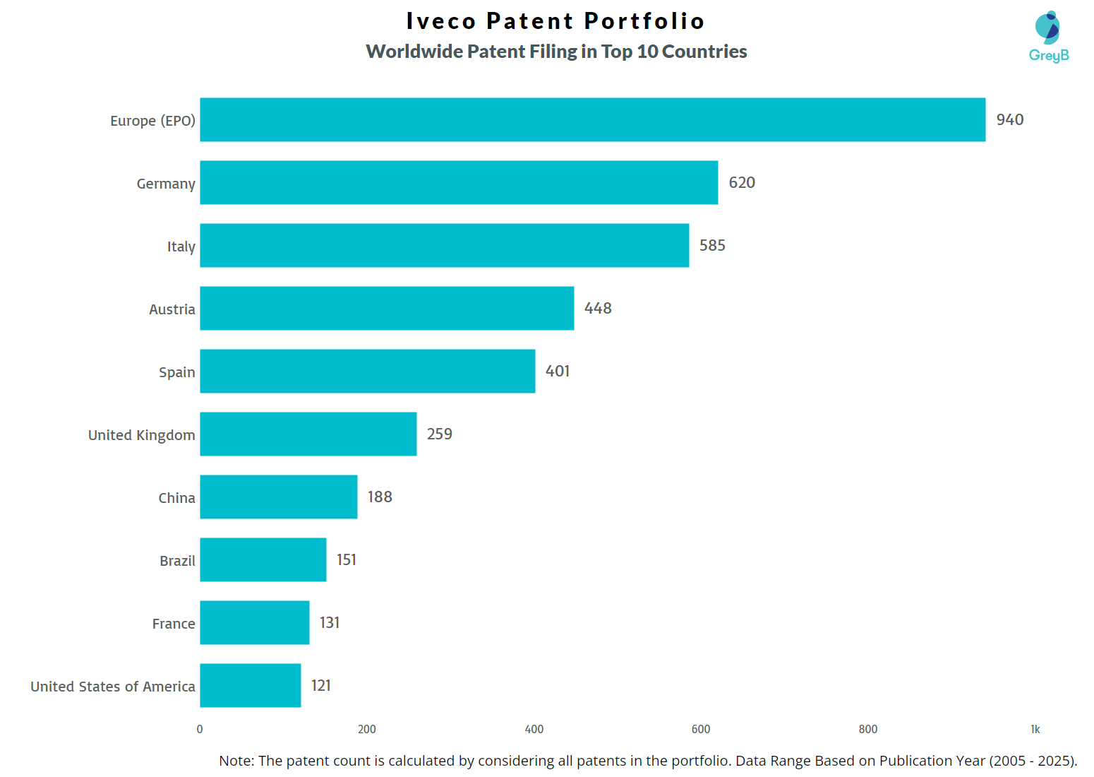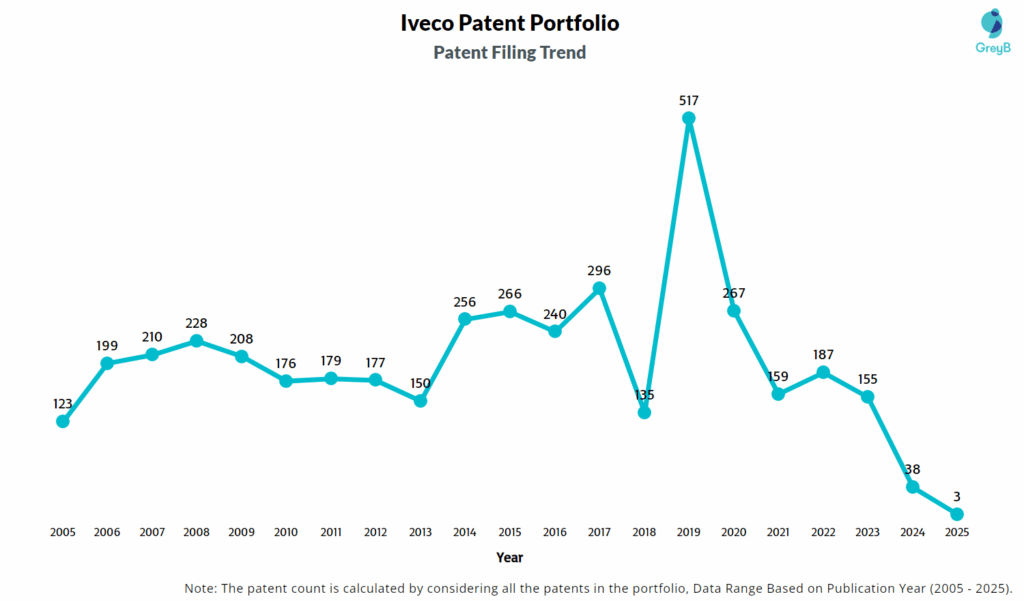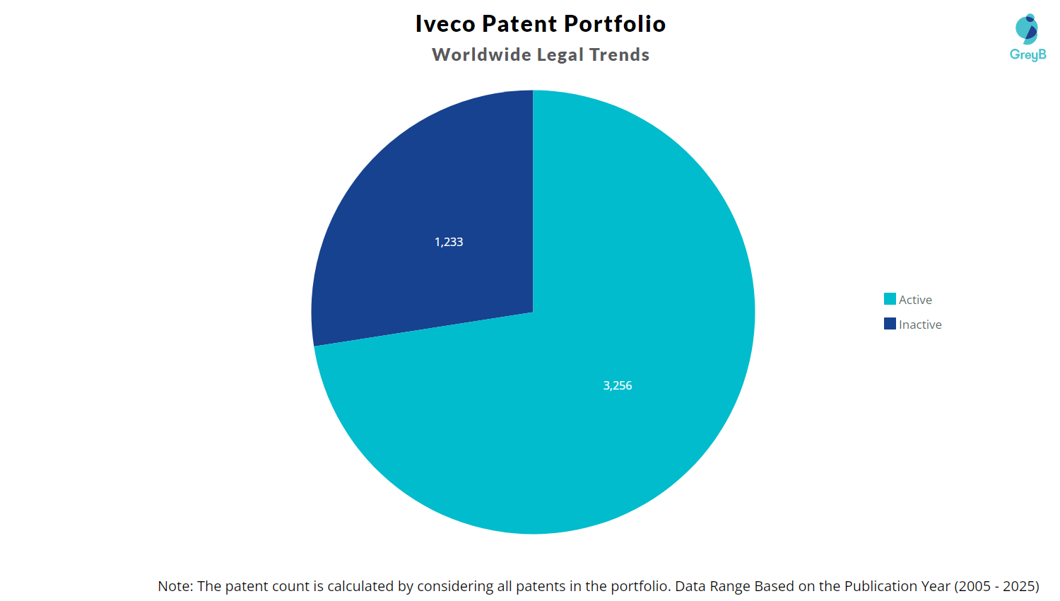 Iveco has a total of 4489 patents globally. These patents belong to 1195 unique patent families. Out of 4489 patents, 3256 patents are active.