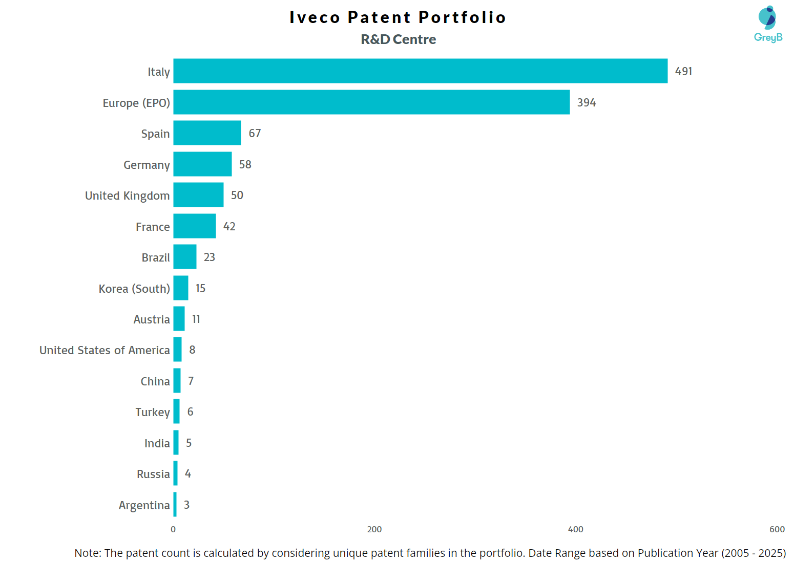 Iveco has a total of 4489 patents globally, out of which 3939 have been granted. Of these 4489 patents, more than 72% patents are active. Europe (EPO) is where Iveco has filed the maximum number of patents, followed by Germany and Italy. Parallelly, Italy seems to be the main focused R&D centre and is also the origin country of Iveco.