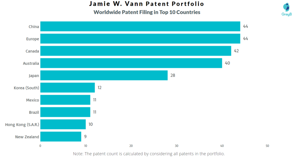 Jamie W Vann has filed 65 patents, out of which 48 have been granted. Of these 65 patents, more than 66% patents are active. Out of these 65 patents, 52 patents filed only in the US, out of which 44 patents has been granted.