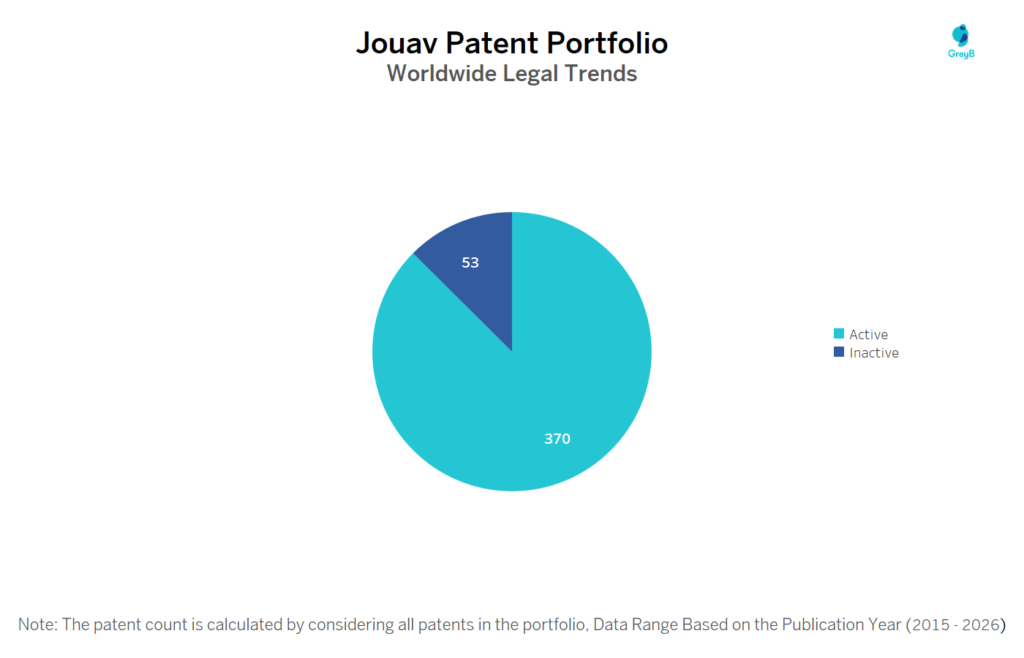 Jouav has a total of 423 patents globally. These patents belong to 411 unique patent families. Out of 423 patents, 370 patents are active.