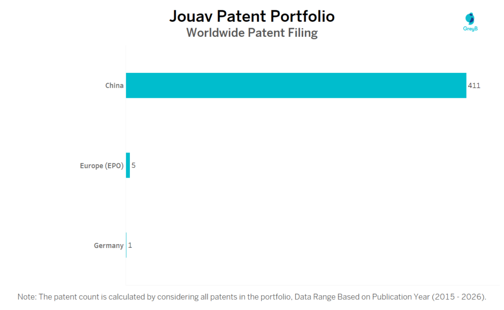 Jouav has a total of 423 patents globally, out of which 308 have been granted. Of these 423 patents, 87% patents are active. China is where Jouav has filed the maximum number of patents, followed by Europe (EPO) and Germany. Parallelly, the China seems to be the main focused R&D centre and is the origin country of Jouav.