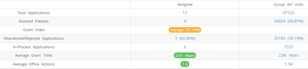Klaria Pharma (Excluding its subsidiaries) has filed 13 patent applications at USPTO so far (Excluding Design and PCT applications). Out of these 4 have been granted leading to a grant rate of 57.14%.