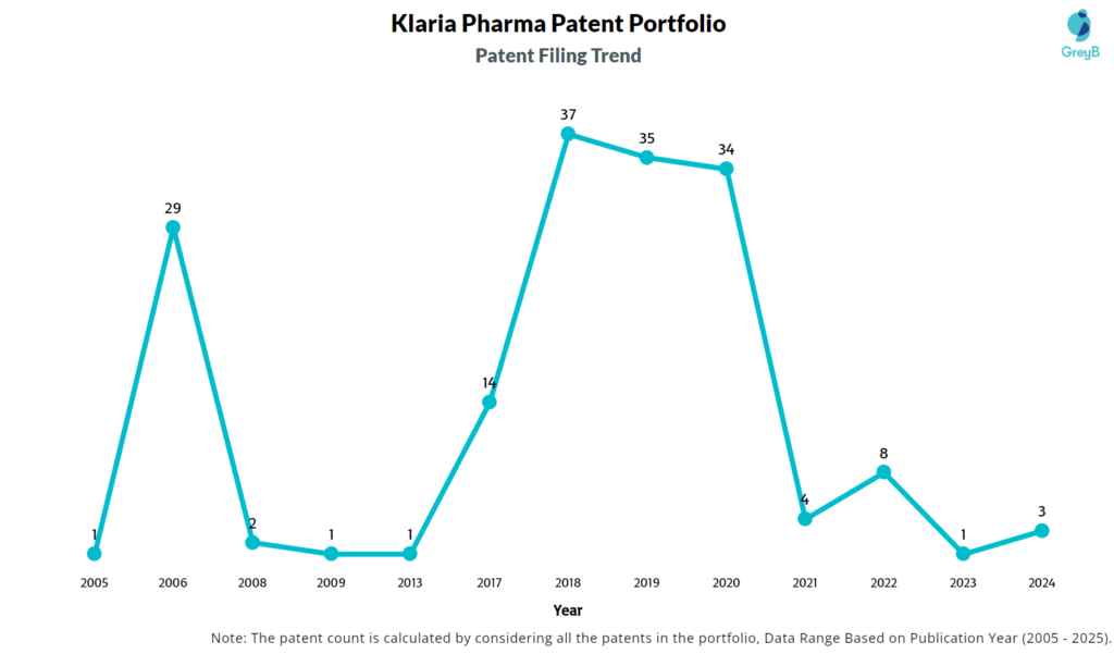| Year of Patents Filing or Grant | Klaria Pharma Applications Filed | Klaria Pharma Patents Granted |