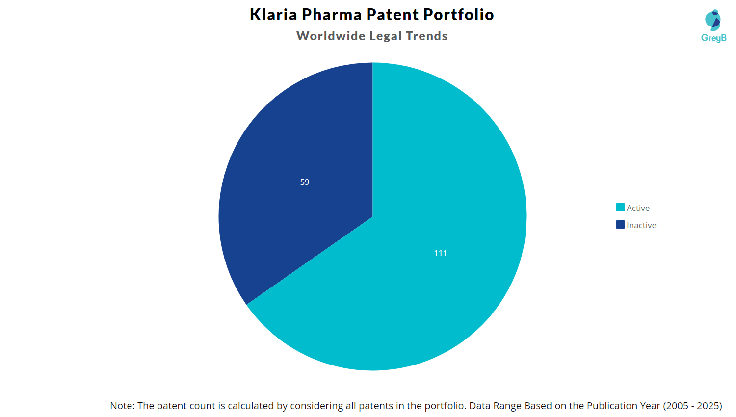 Klaria Pharma has a total of 170 patents globally. These patents belong to 11 unique patent families. Out of 170 patents, 111 patents are active.