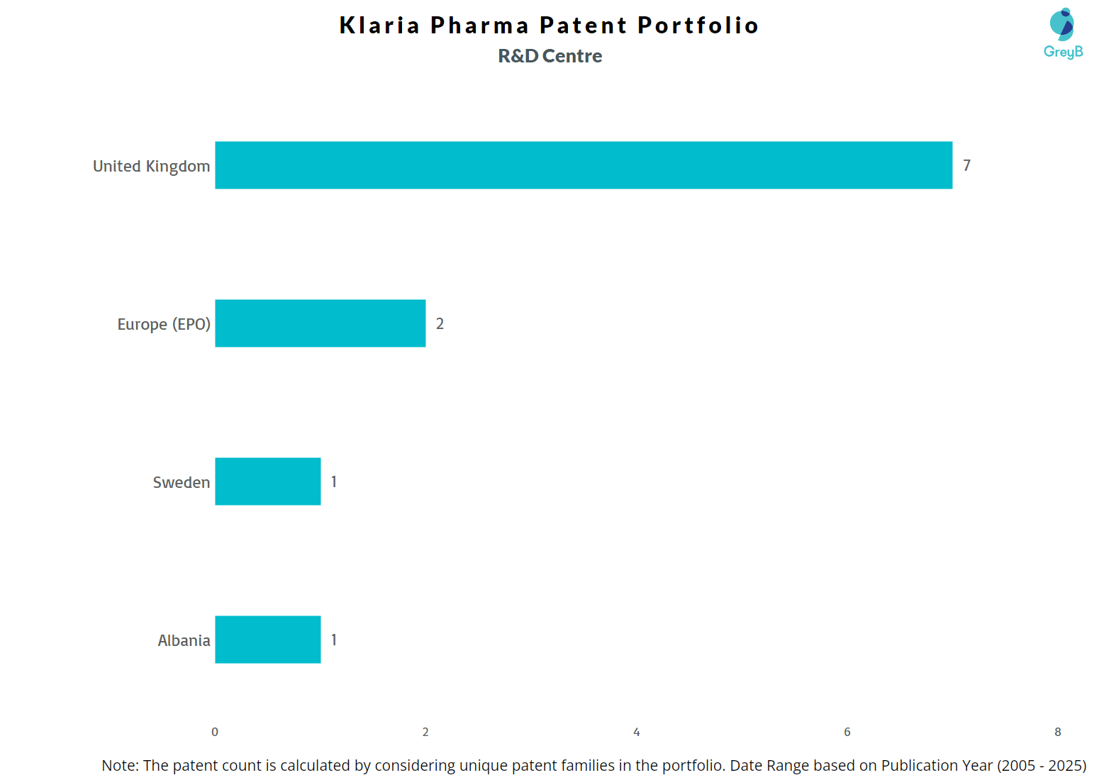 Klaria Pharma has a total of 170 patents globally, out of which 70 have been granted. Of these 170 patents, more than 65% patents are active. The United States of America is where Klaria Pharma has filed the maximum number of patents, followed by Europe (EPO) and China. Parallelly, United Kingdom seems to be the main focused R&D centre and also Sweden is the origin country of Klaria Pharma.