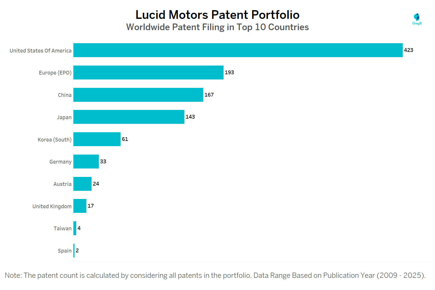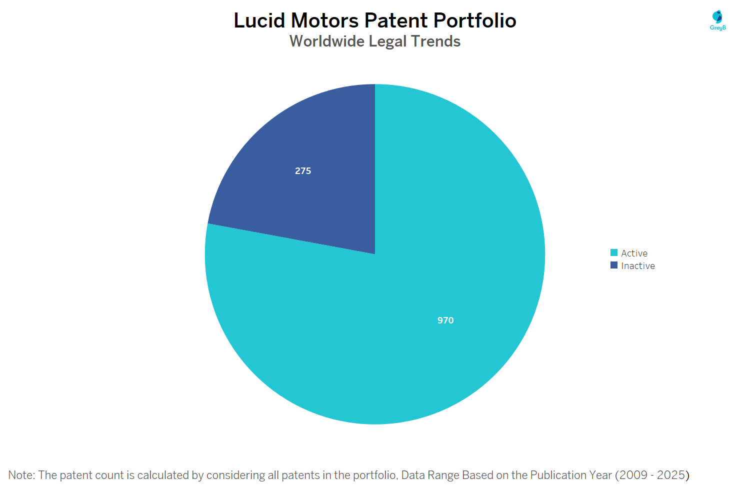 Lucid Motors has a total of 1245 patents globally. These patents belong to 365 unique patent families. Out of 1245 patents, 970 patents are active.
