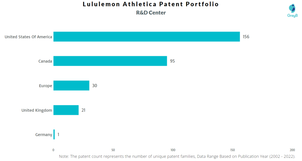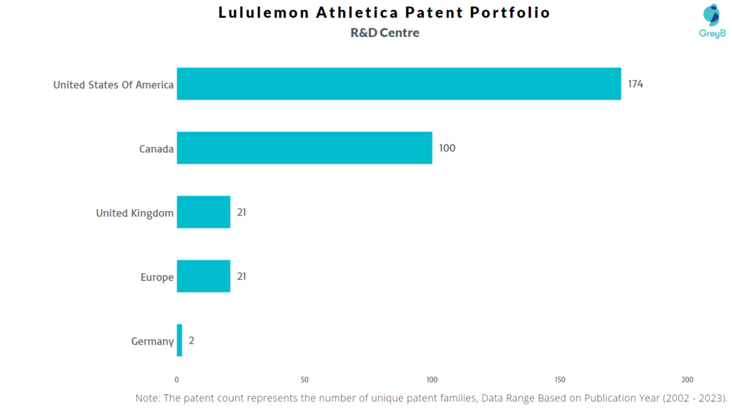 Lululemon Athletica has a total of 925 patents globally, out of which 661 have been granted. Of these 925 patents, more than 78% patents are active. United States of America is where Lululemon Athletica has filed the maximum number of patents, followed by Canada and Europe (EPO). Parallelly, United States of America seems to be the main focused R&D centre and also Canada is the origin country of Lululemon Athletica.