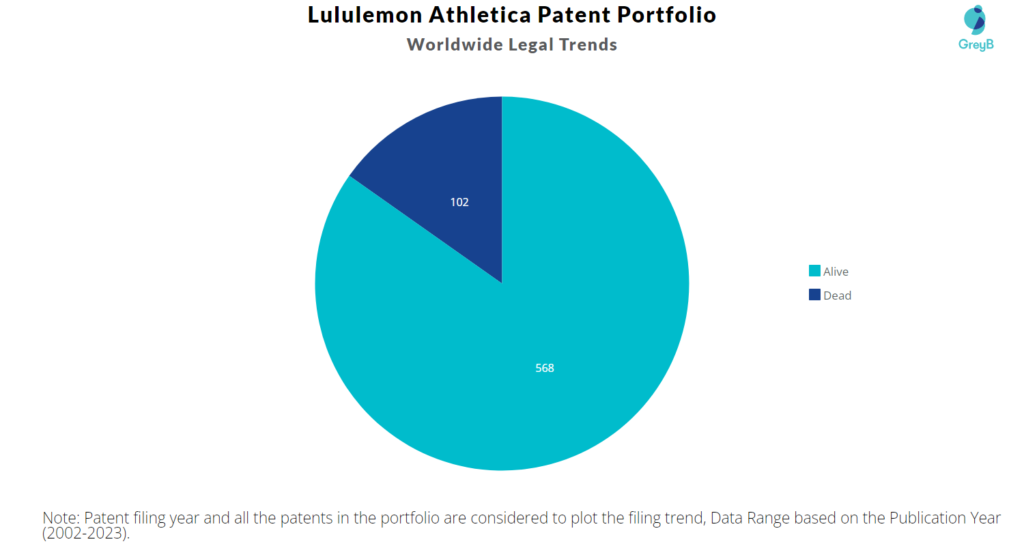 Lululemon Athletica has a total of 925 patents globally. These patents belong to 400 unique patent families. Out of 925 patents, 717 patents are active.