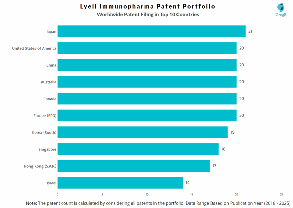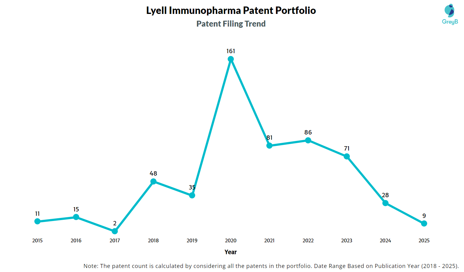 Lyell Immunopharma has a total of 298 patents globally, out of which 18 have been granted. Of these 298 patents, more than 75% patents are active. Japan is where Lyell Immunopharma has filed the maximum number of patents, followed by United States of America and China. Parallelly, USA seems to be the main focused R&D centre and also is the origin country of Lyell Immunopharma.