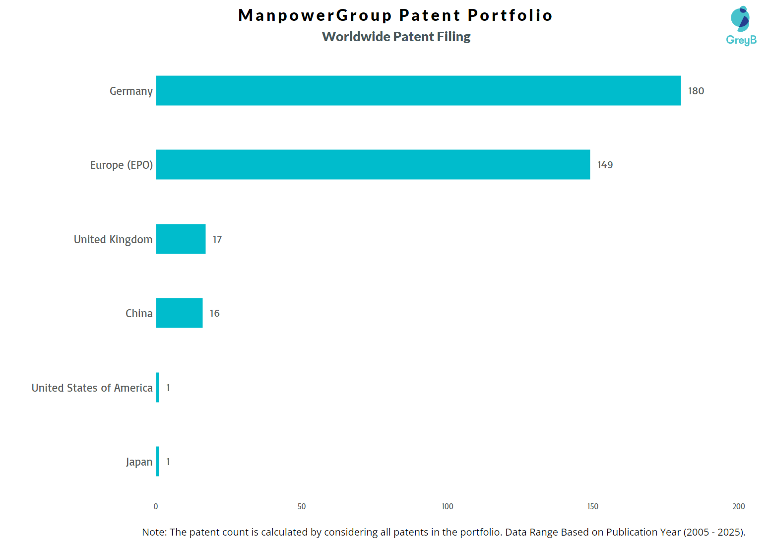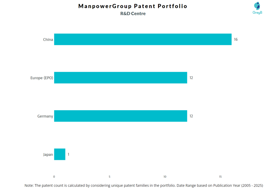 ManpowerGroup has a total of 364 patents globally, out of which 350 have been granted. Of these 364 patents, more than 8% patents are active. Germany is where ManpowerGroup has filed the maximum number of patents, followed by Europe (EPO) and United Kingdom. Parallelly, China seems to be the main focused R&D centre and also USA is the origin country of ManpowerGroup.