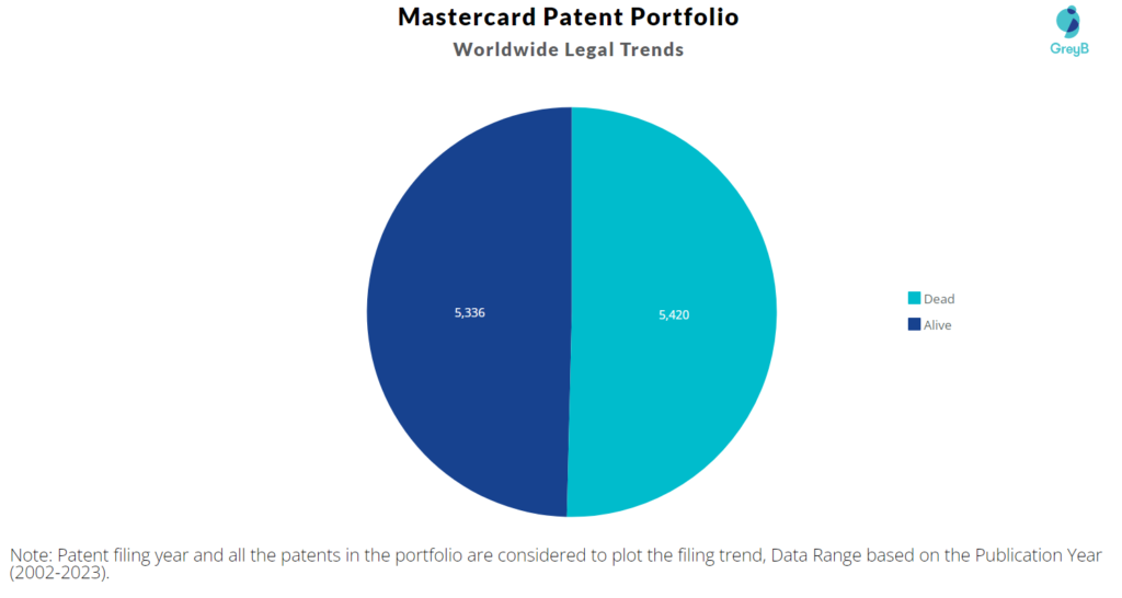 Mastercard has a total of 10689 patents globally. These patents belong to 4174 unique patent families. Out of 10689 patents, 5331 patents are active.