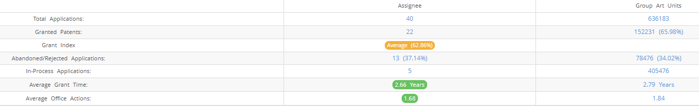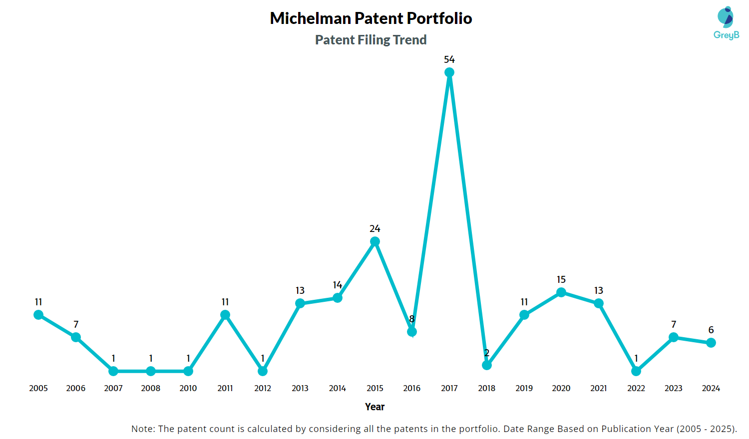Michelman (Excluding its subsidiaries) has filed 40 patent applications at USPTO so far (Excluding Design and PCT applications). Out of these 22 have been granted leading to a grant rate of 62.86%.