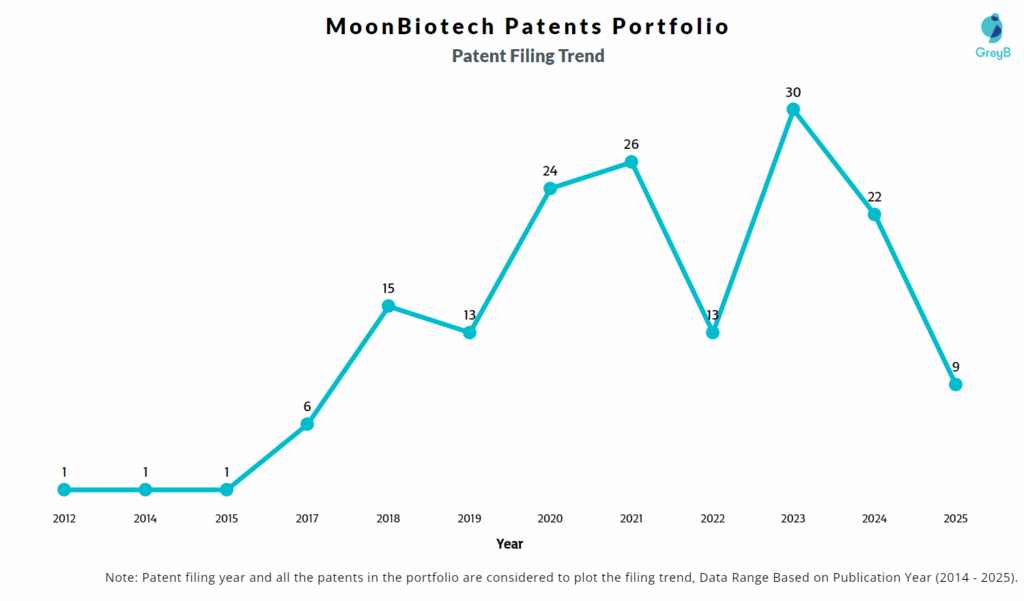 | Year of Patents Filing or Grant | MoonBiotech Applications Filed | MoonBiotech Patents Granted |