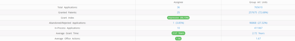 NanoXplore (Excluding its subsidiaries) has filed 36 patent applications at USPTO so far (Excluding Design and PCT applications). Out of these 25 have been granted leading to a grant rate of 96.15%.