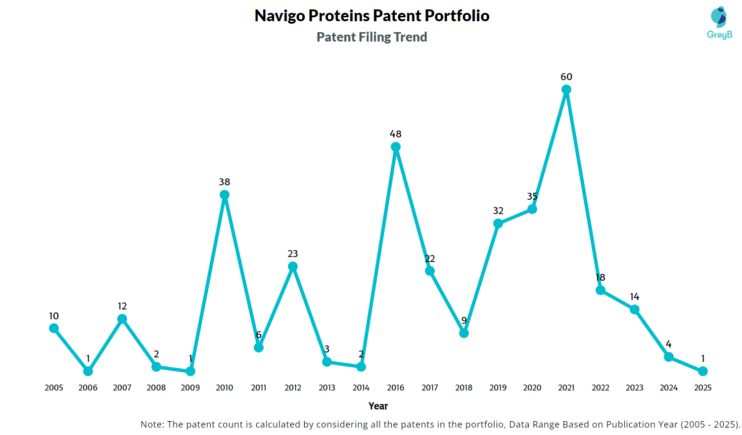| Year of Patents Filing or Grant | Navigo Proteins Applications Filed | Navigo Proteins Patents Granted |