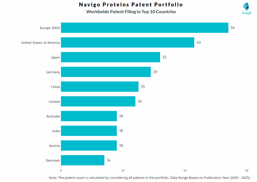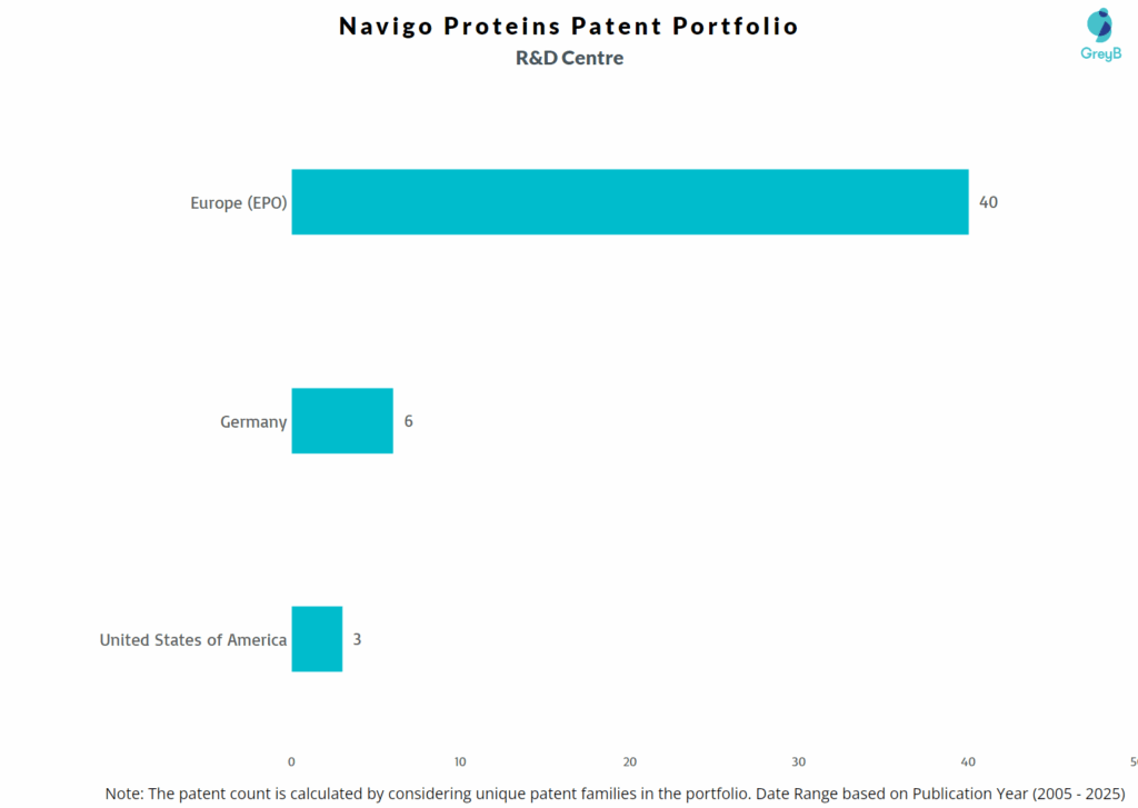 Navigo Proteins has a total of 388 patents globally, out of which 187 have been granted. Of these 388 patents, more than 60% patents are active. Europe (EPO) is where Navigo Proteins has filed the maximum number of patents, followed by United States of America and Japan. Parallelly, Europe (EPO) seems to be the main focused R&D centre and Germany is the origin country of Navigo Proteins.