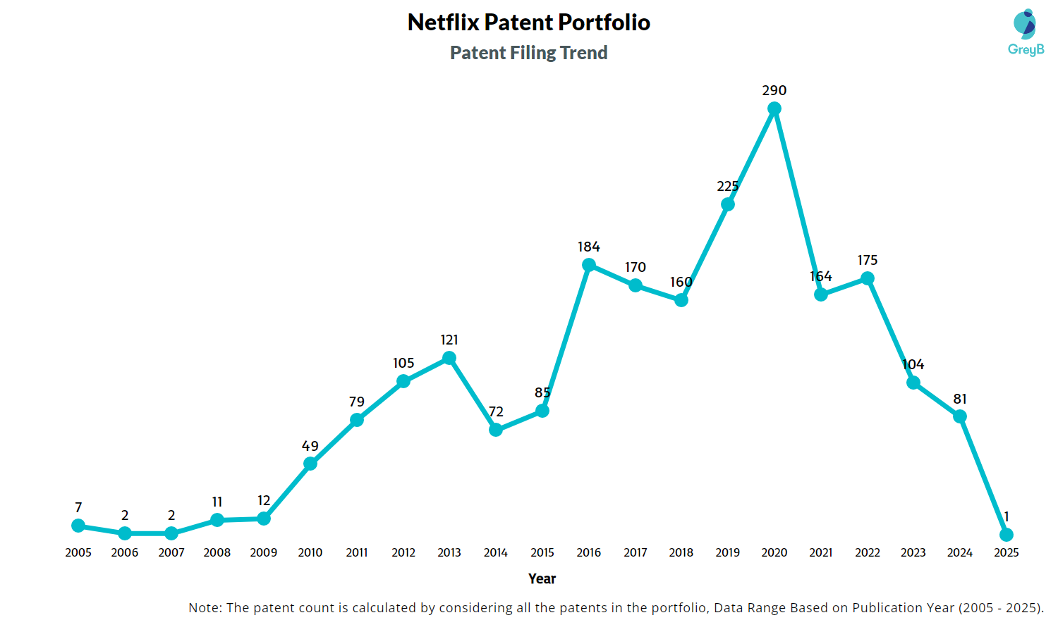 Netflix has filed 545 patent applications at USPTO so far (Excluding Design and PCT applications). Out of these 437 have been granted leading to a grant rate of 97.33%.