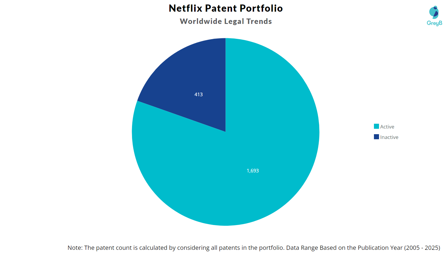 Also, 413 out of 2106 patents are inactive in the Netflix patent portfolio. These inactive patents include 396 applications and 17 granted patents. The rest of 1693 alive patent documents consists of 468 applications and 1225 granted patents.