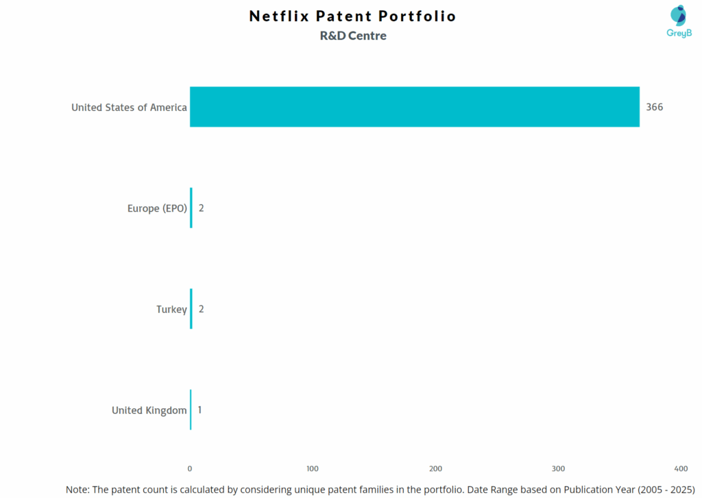 Netflix’s patent portfolio has a total of 2106 patents in its worldwide patent portfolio which belong to 371 unique patent families. Out of 2106 patents, 864 are patent applications, and 1242 are granted patents.