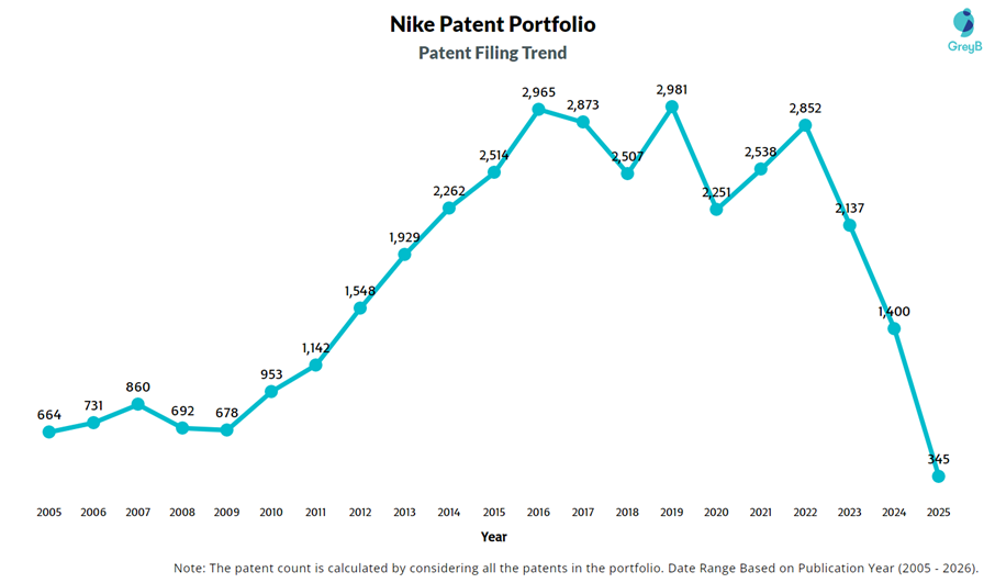 Nike’s patent filing activity increased consistently from 2005 onward, accelerating significantly after 2010 and reaching peak levels between 2016 and 2022. During this period, Nike regularly filed over 2,500 patents per year, demonstrating sustained innovation output. The decline observed after 2022 does not erase this long growth cycle but may reflect strategic adjustments or timing effects in the numbers. The overall trajectory clearly shows a strong expansion phase followed by recent stabilization.