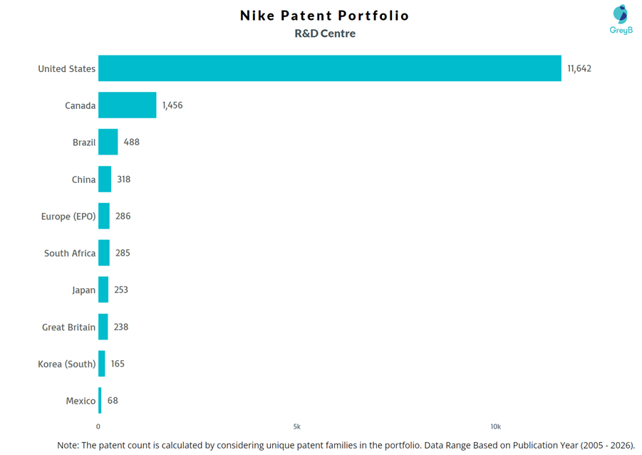 Nike hold more than 35000 patents and leading the race in of patent innovation in footwear industry, The United States of America is native country of Nike and more than 37% patents of Nike portfolio belongs to the USA.