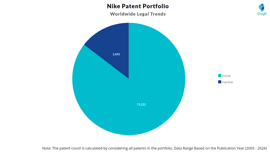 Nike has a total of 35300 patents globally. These patents belong to 16186 unique patent families. Out of 35300 patents, 27727 patents are active.