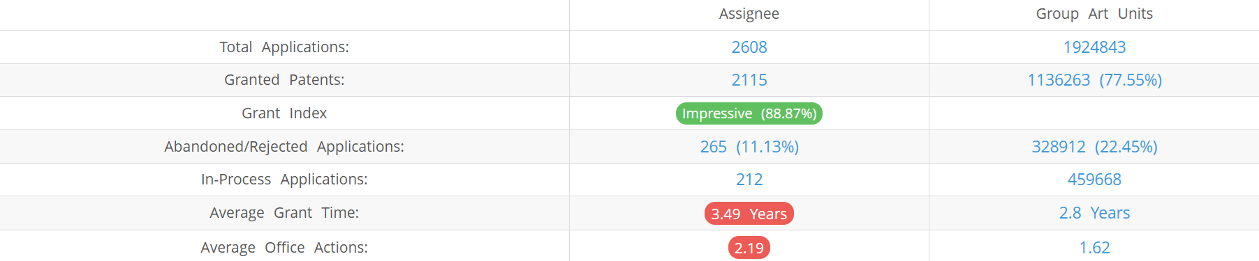 Nintendo (Excluding its subsidiaries) has filed 2608 patent applications at USPTO so far (Excluding Design and PCT applications). Out of these 2115 have been granted leading to a grant rate of 88.87%.