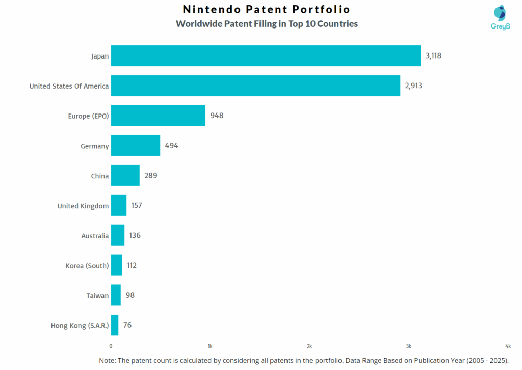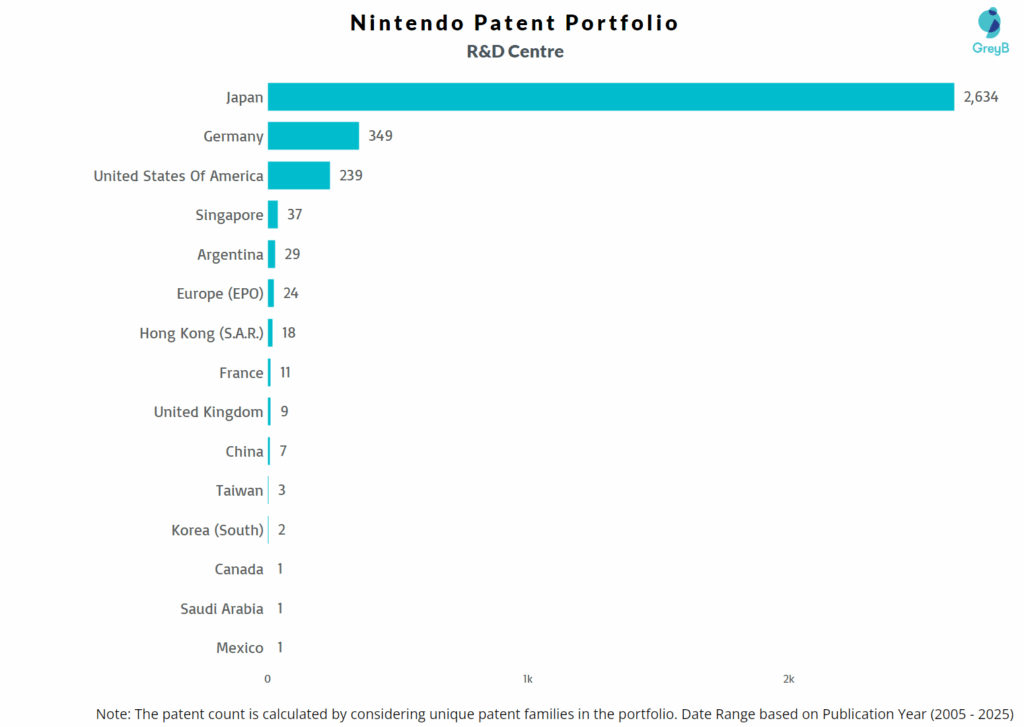Nintendo has a total of 8788 patents globally, out of which 7194 have been granted. Of these 8788 patents, more than 69% patents are active. Japan is where Nintendo has filed the maximum number of patents, followed by the United States of America and Europe (EPO). Parallelly, Japan seems to be the main focused R&D center and also is the origin country of Nintendo.