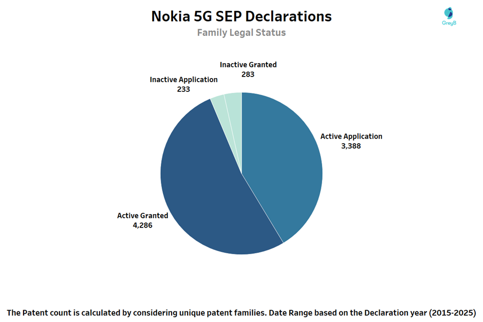 Nokia has 8,190 patent families declared in ETSI SEP, reflecting the scale of its contribution to 5G standards. The chart clearly shows that a major share of these families are active granted patents, which highlights the legal strength and enforceability of Nokia portfolio. Alongside this, a large number of active applications indicates that the portfolio is still growing, ensuring continued relevance in future 5G developments.