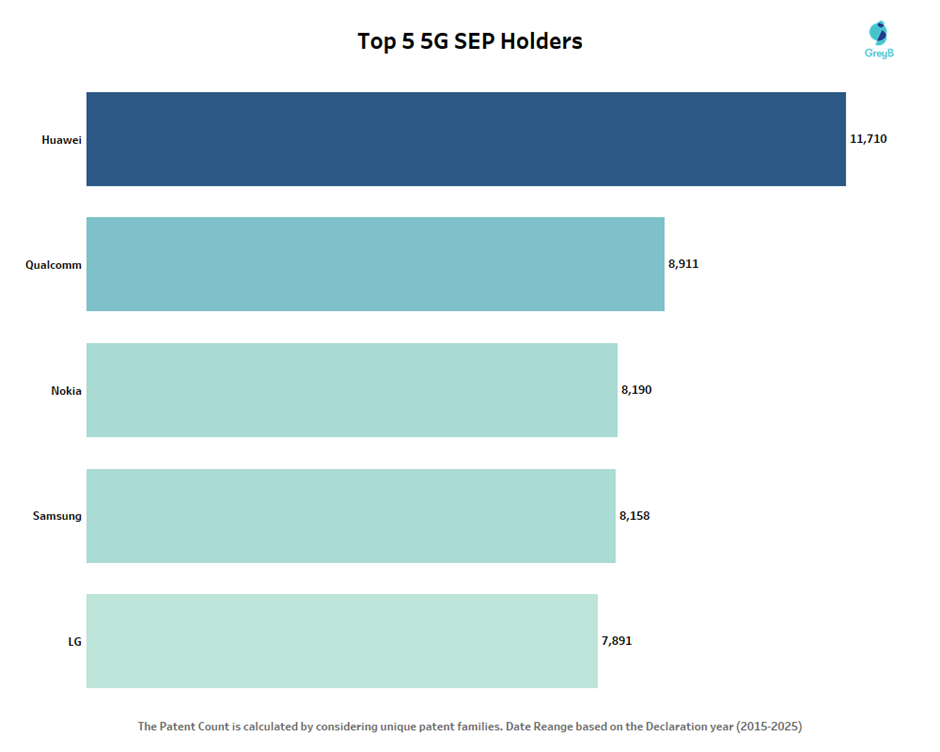 Huawei leads the 5G SEP landscape with a significant margin in declared patent families, highlighting its strong standardization influence. Qualcomm, Nokia, and Samsung follow closely, demonstrating intense competition among major telecom innovators. The concentration of SEPs among these top players reflects a highly competitive and strategically controlled 5G ecosystem.