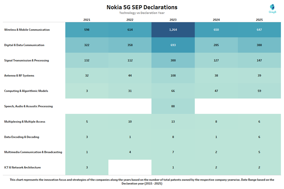 Nokia 5G patent activity tells a story of a major innovation push at just the right time. Between 2021 and 2023, the company sharply increased its patent declarations, especially in Wireless & Mobile Communication and Digital & Data Communication, with 2023 standing out as a peak year. This suggests a strong effort to secure positions in the most important technologies that make 5G networks function.