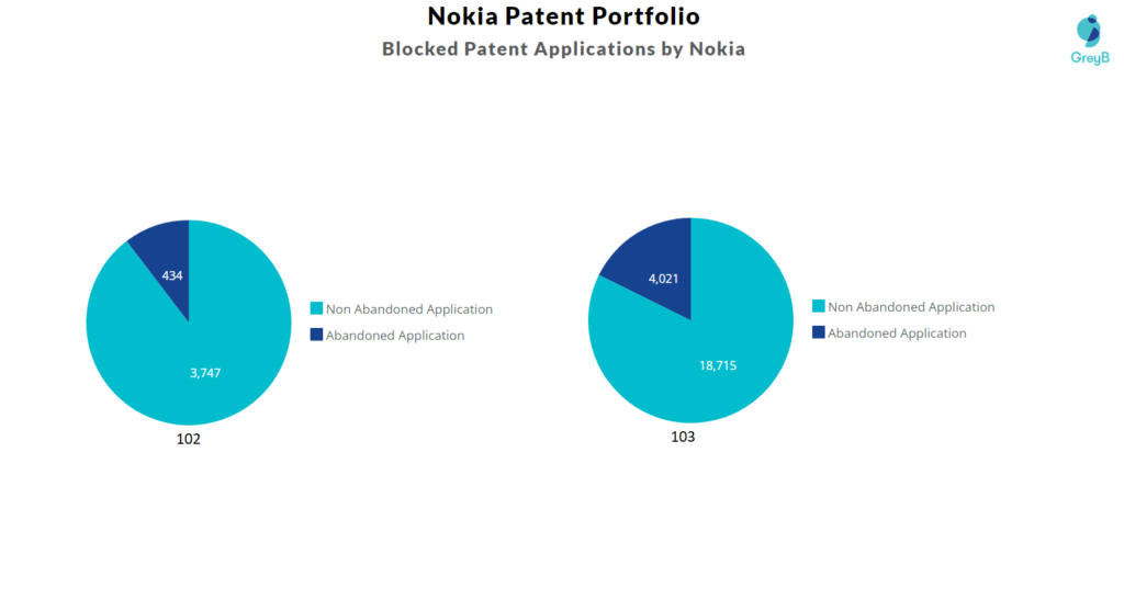 | Company | Number of Patent Applications that faced Rejection Citing Nokia Patents | Number of Rejections (102 & 103) |