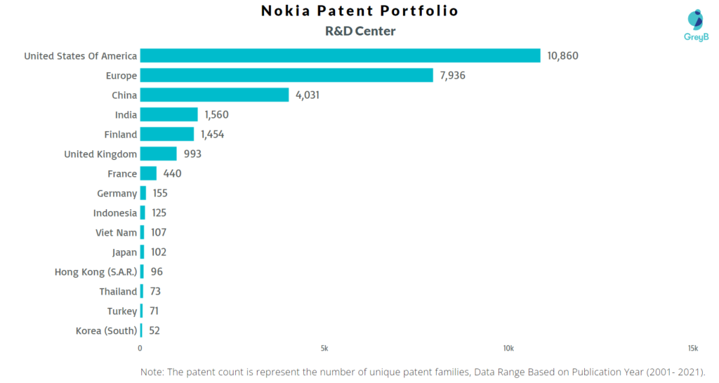 Nokia has a total of 56945 patents globally, out of which 26281 have been granted. Of these 56945 patents, more than 59% patents are active. Europe is where Nokia has filed the maximum number of patents, followed by United States of America and China. Parallelly, United States of America seems to be the main focused R&D centre and also Finland is the origin country of Nokia.