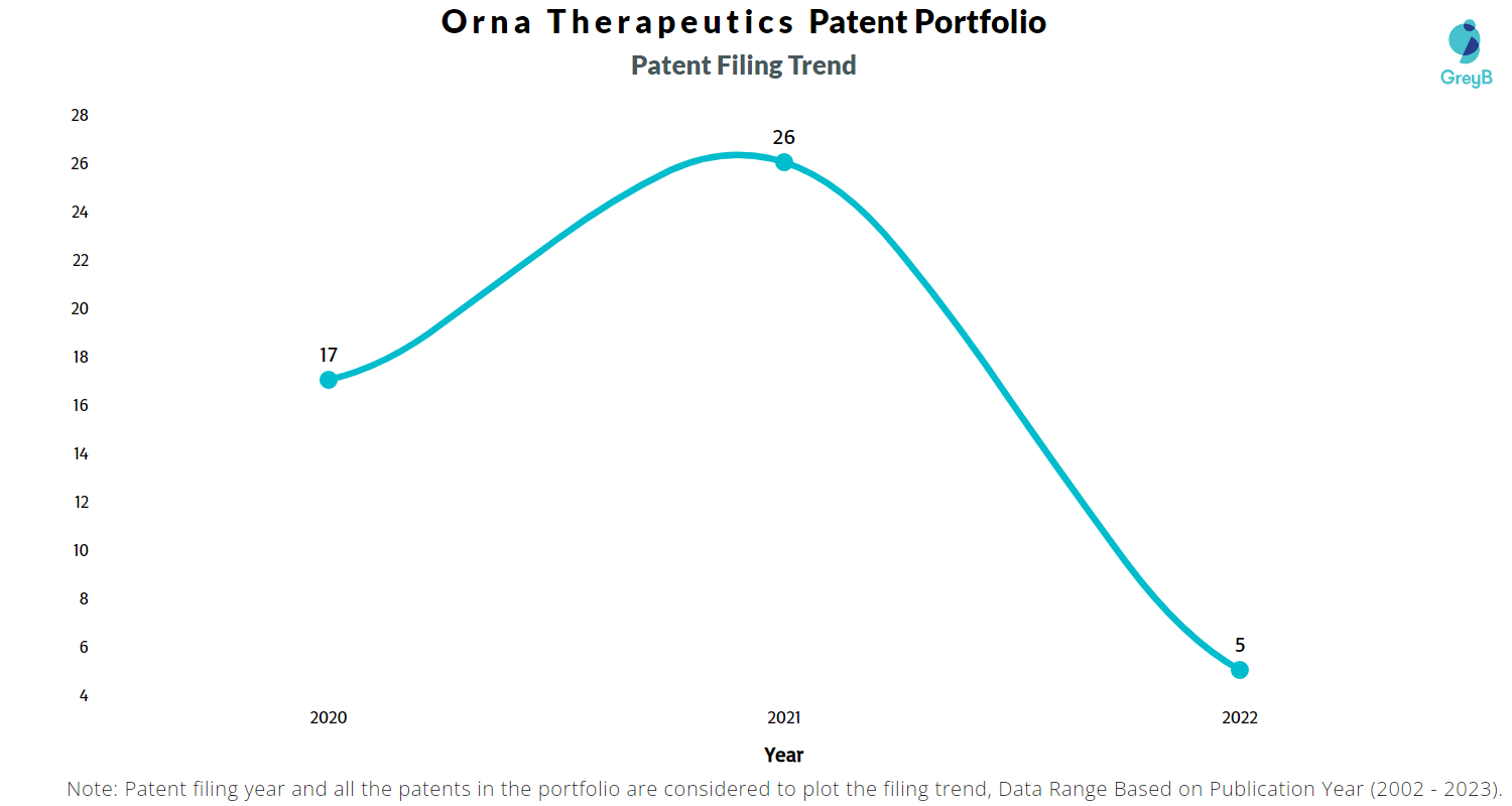 Orna Therapeutics has a total of 48 patents globally. These patents belong to 5 unique patent families. Out of 48 patents, 43 patents are active.