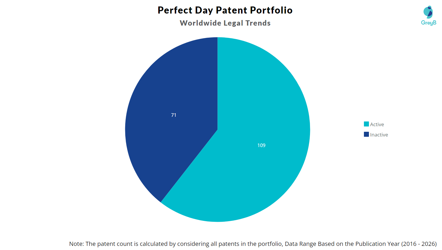 Perfect Day has a total of 180 patents globally. These patents belong to 21 unique patent families. Out of 180 patents, 109 patents are active.