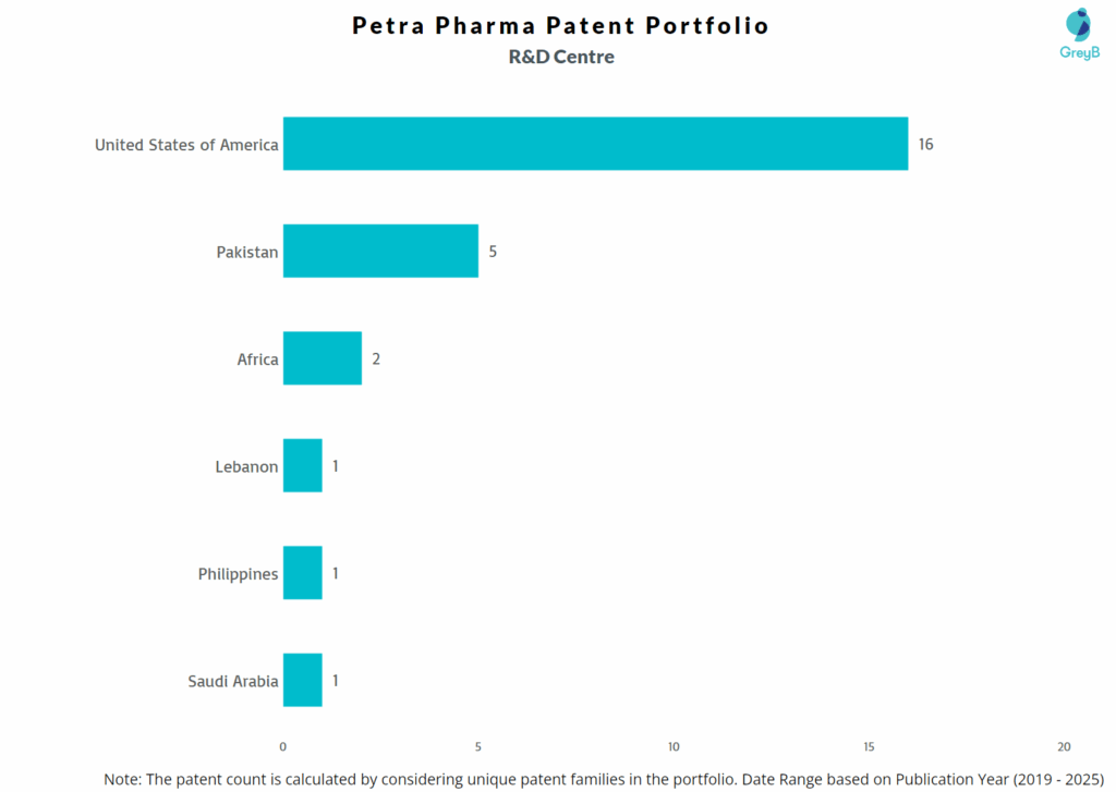 Petra Pharma has a total of 148 patents globally, out of which 15 have been granted. Of these 148 patents, more than 87% patents are active. Australia is where Petra Pharma has filed the maximum number of patents, followed by Taiwan and United States of America. Parallelly, United States of America seems to be the main focused R&D centre and also is the origin country of Petra Pharma.