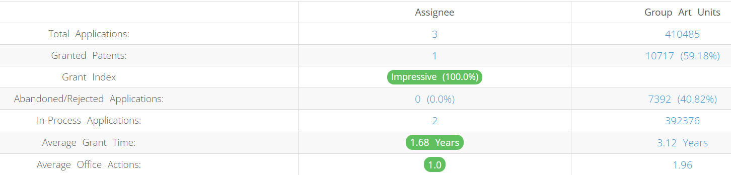 PhageLab (Excluding its subsidiaries) has filed 3 patent applications at USPTO so far (Excluding Design and PCT applications). Out of these 1 have been granted leading to a grant rate of 100.0%.